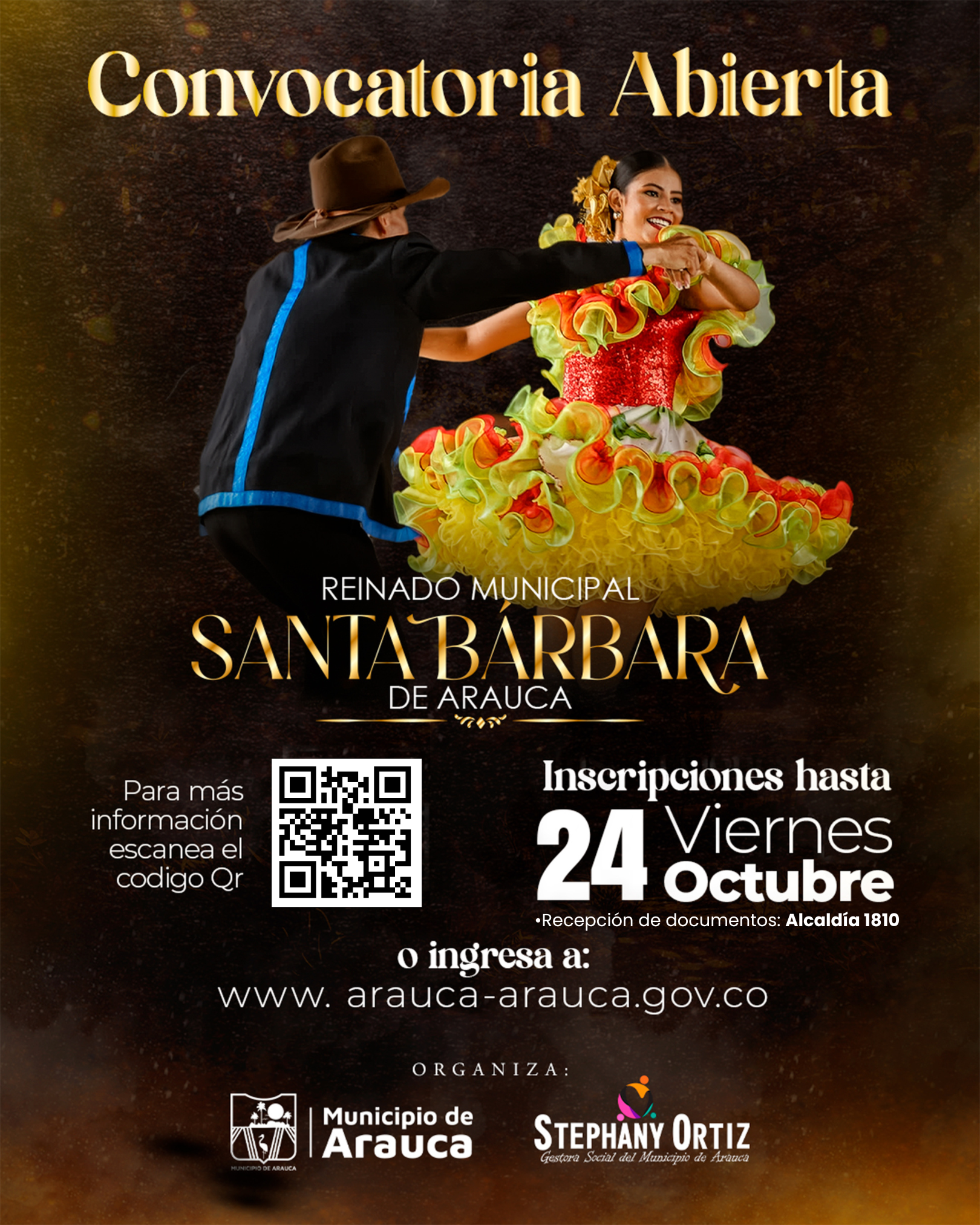 La Alcaldía de Arauca a través de Gestoría Social liderada por Stephany Ortíz en articulación con Secretaría de Educación y Agricultura lanza la convocatoria para el Reinado Municipal Santa Bárbara de Arauca, en el marco de las Ferias Agropecuarias y Ganaderas del municipio de Arauca.
