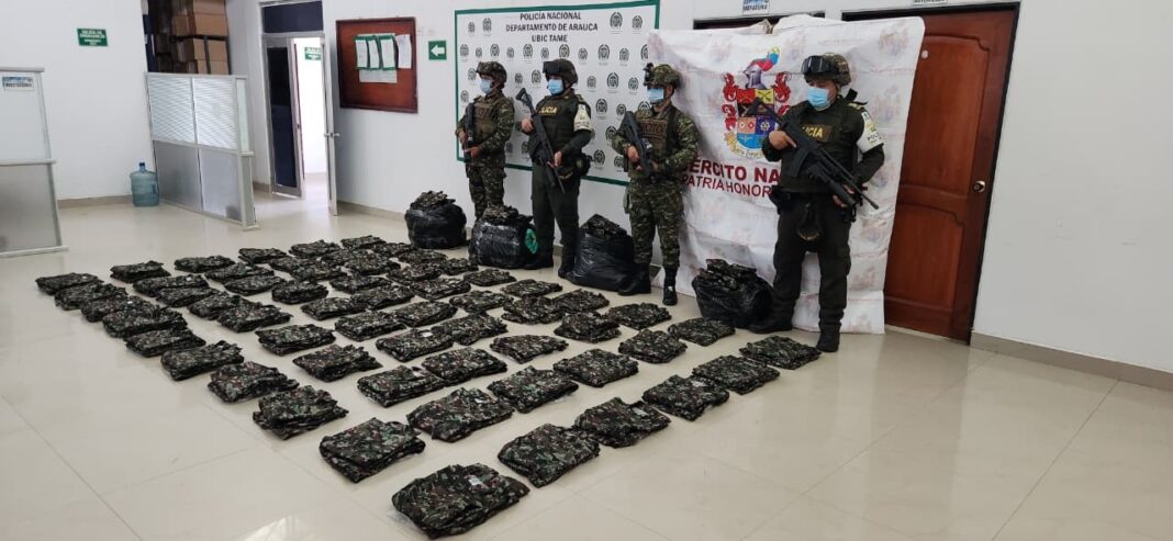 En medio de estas inspecciones fue identificado un envío proveniente de Bogotá y con destino a Tame que contenía 120 uniformes tipo camaleón, sin serial y elaborados en tela Lafayette, material que habría sido destinado a los grupos armados residuales (GAO-r) que delinquen en la región.