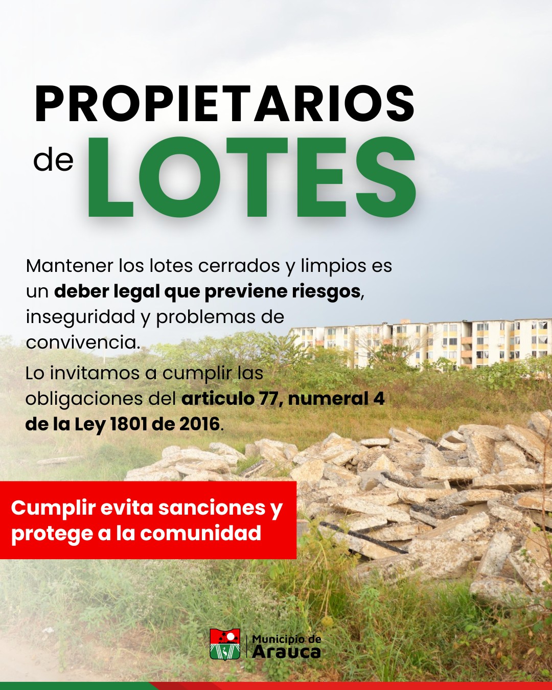 La Secretaría de Gobierno Municipal recuerda a los propietarios de lotes del incumplimiento del mantenimiento, cerramiento y limpieza de estos implicando sanciones conforme al artículo 77, numeral 4 de la Ley 1801 de 2016 – Código Nacional de Seguridad y Convivencia Ciudadana.