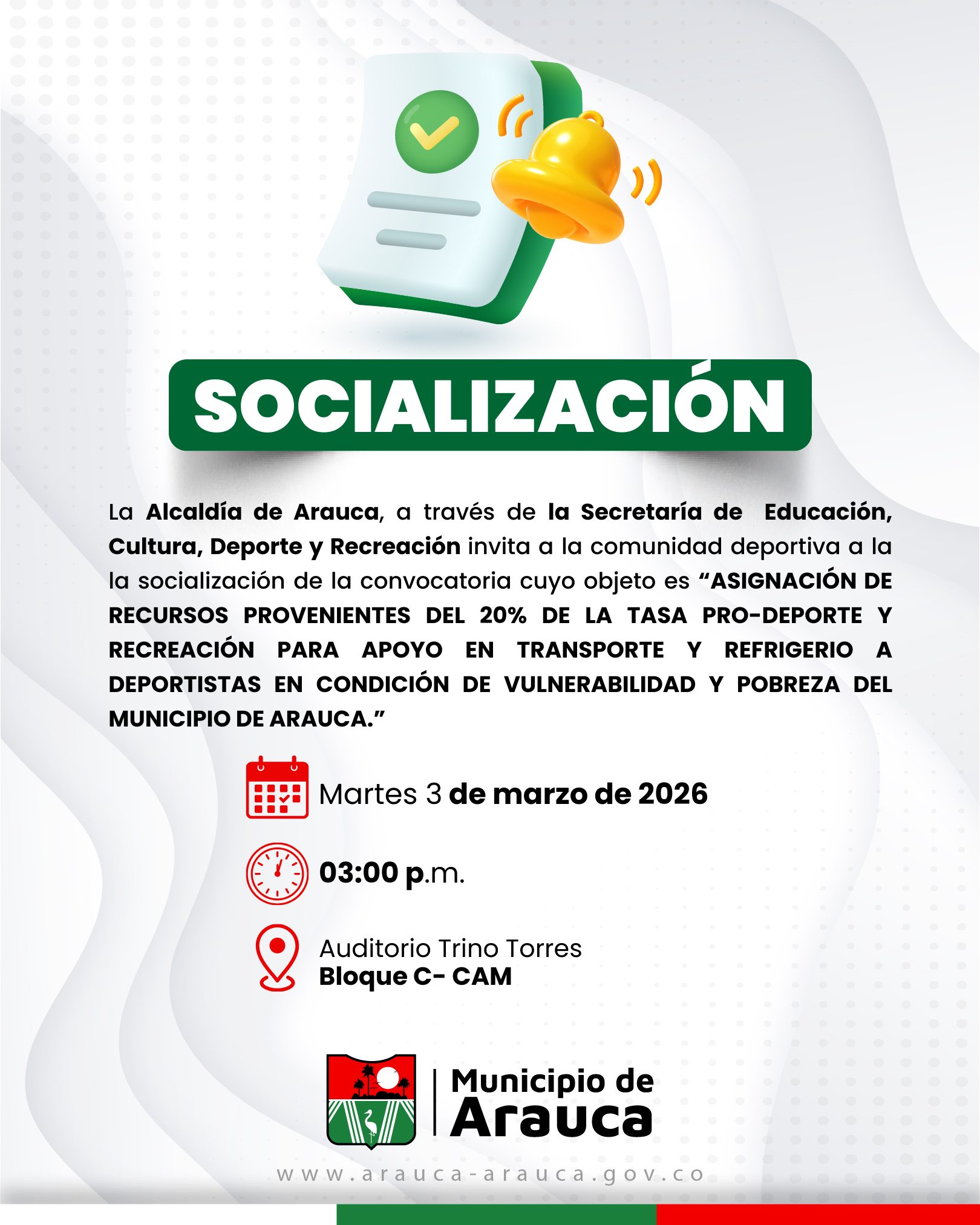 La Alcaldía de Arauca a través de la Secretaría de Educación, Cultura, Deporte y Recreación apertura la convocatoria de asignación de recursos provenientes del 20% de la tasa pro-deporte y recreación para apoyo en transporte y refrigerio a deportistas en condición de vulnerabilidad y pobreza pertenecientes a clubes deportivos reconocidos en el municipio de Arauca.